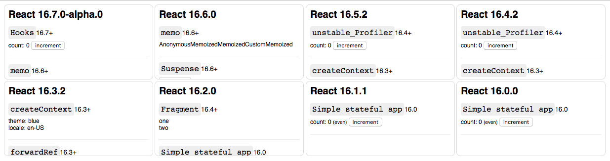The v16 test app progressively adds React features based on the current minor version so that we can share code between various minor versions.