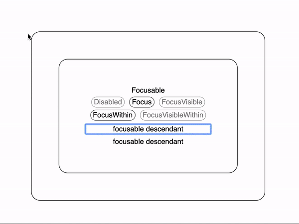 What if you want to combine focus within and focus visible? i.e. in the date picker example I showed above, the focus ring gets bolder on focus visible. But the immediate child of the The current PR allows that by changing the behavior of the events to apply to descendants so that I can handle FWIW, I don't think this is directly possible in CSS either (combining :focus-visible and :focus-within). |