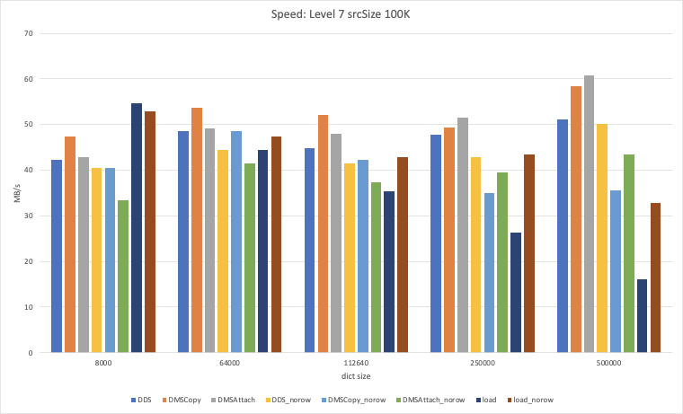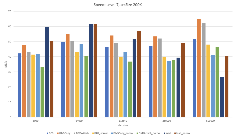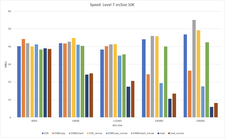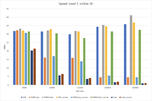 Some comparisons of DDS vs. DMS attach vs. DMS copy to help inform a decision on what to do about the three methods. Results for force dict reloading are included too, though those are separate from the main topic here. It actually seems like one of DMS+attach or DMS+copy is typically faster than DDS, except on the smaller src Sizes (where non-row has the advantage). So if the auto-selection configuration as it is right now is somewhat accurate, these results actually seem to indicate that we don't need DDS. For the case that we typically care about for dictionary compression (smaller srcSize), DMS+attach actually seems to be faster than DDS, and DMS+copy is still pretty good for the larger srcSizes. For reference, the All of the results below are for level 7, with Ratio: