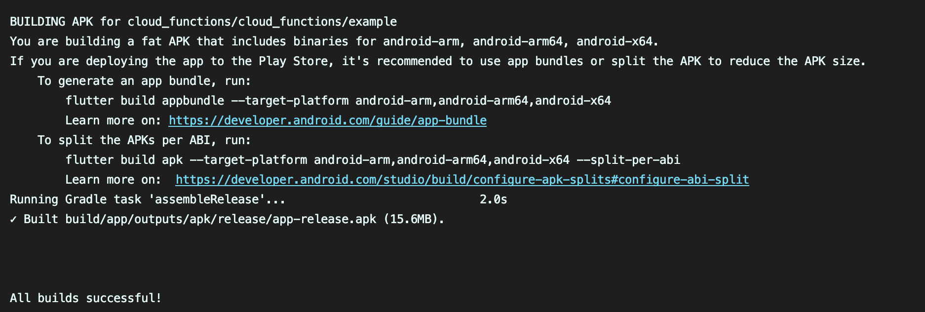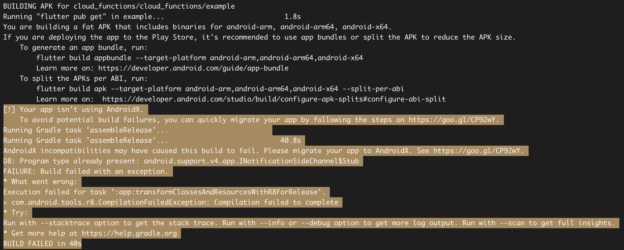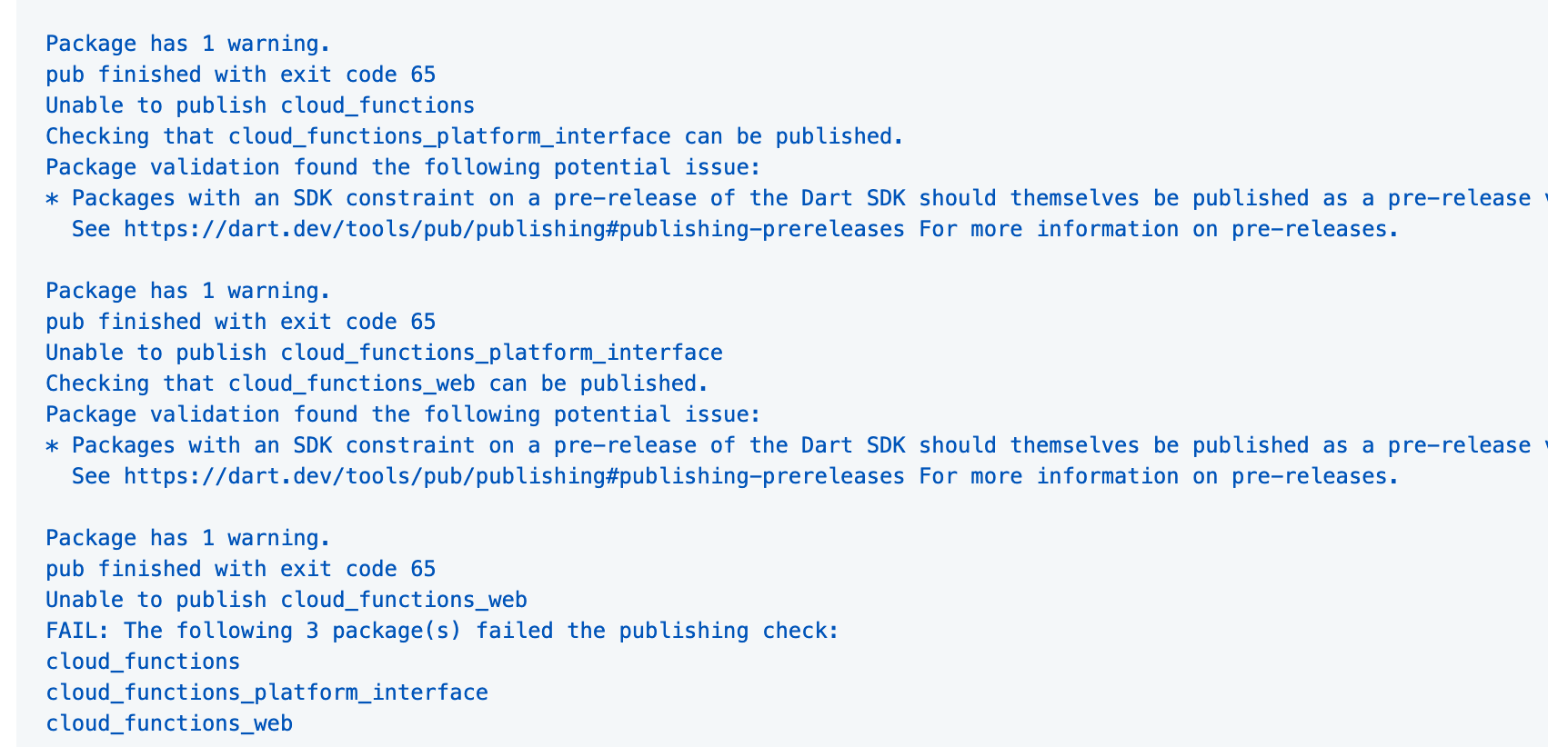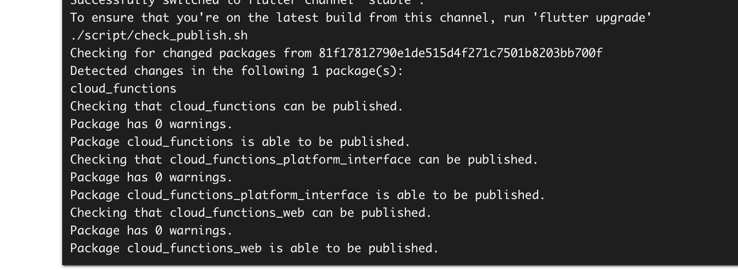gradle.propertiesAndroidX properties tocloud_functionsexample repositoryPackages with an SDK constraint on a pre-release of the Dart SDK should themselves be published as a pre-release version. If this package needs Dart version 2.0.0-dev.28.0, consider publishing the package as a pre-release instead.CI publishable issue.Before