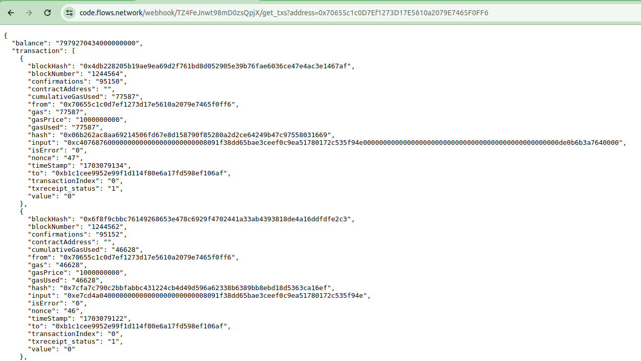 Copy and paste the endpoint URL to your browser and add /get_pbm_from_txs?address=0x70655c1c0D7Ef1273D17E5610a2079E7465F0FF6. Then you can see the transaction result.