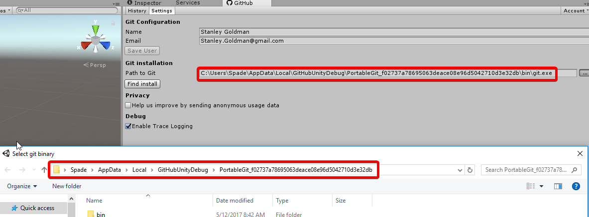 Git Path: C:\Users\[Username]\AppData\Local\GitHubUnityDebug\PortableGit_f02737a78695063deace08e96d5042710d3e32db\bin\git.exe
