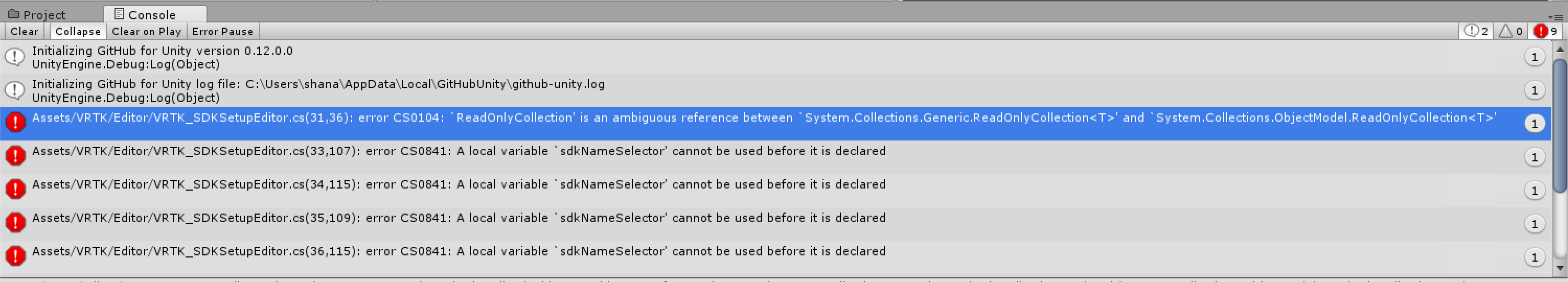 The easy fix is for VRTK to disambiguate the type by specifying the namespace to it. However, we are adding new types to the .net namespace that scripts aren't expecting, so this breakage is likely to happen to other scripts as well. We should probably be nice citizens and not add types to the System namespaces to avoid random clashes like this.