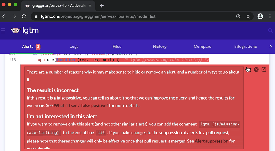 **Description of the issue** Fancy "scroll to anchor" feature doesn't take you to the correct place in neither Chrome nor Safari. (and is off in Firefox)  <!-- Please explain briefly what is the problem. If it is about an LGTM project, please include its URL.--> https://lgtm.com/help/lgtm/exploring-project-alerts#what-if-i-see-a-false-positive