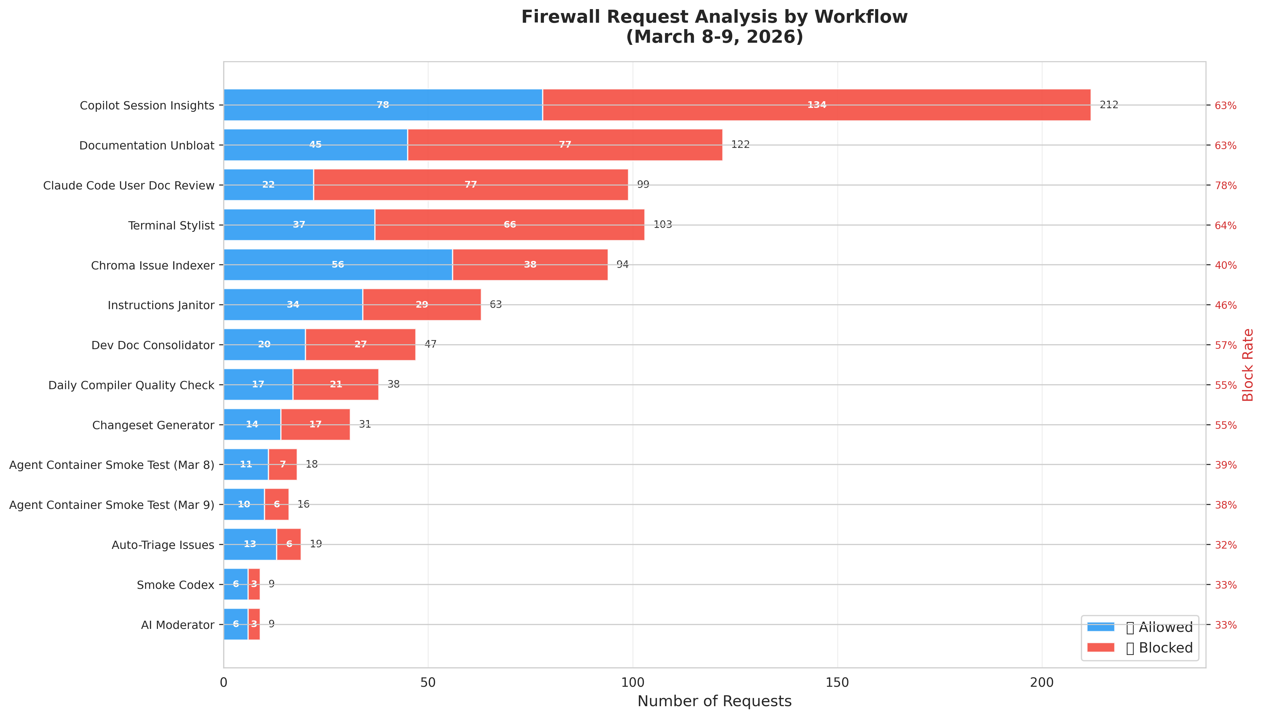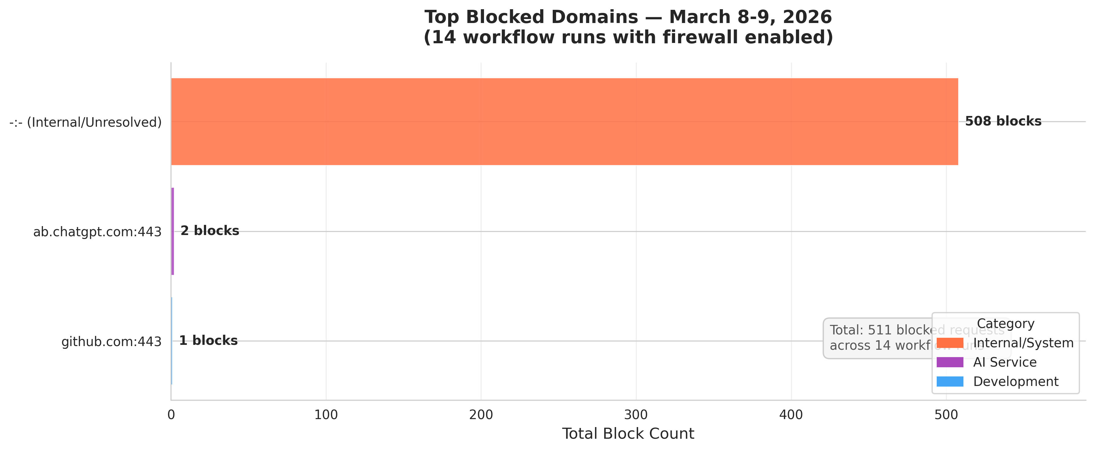 This report covers firewall activity across all agentic workflows that ran with firewall enabled over the past 7 days (data available: March 8–9, 2026). A total of 14 completed workflow runs were analyzed across 13 distinct workflows, collectively generating 880 network requests — of which 511 were blocked (58% block rate). The dominant blocked traffic category is internal/unresolved destinations (