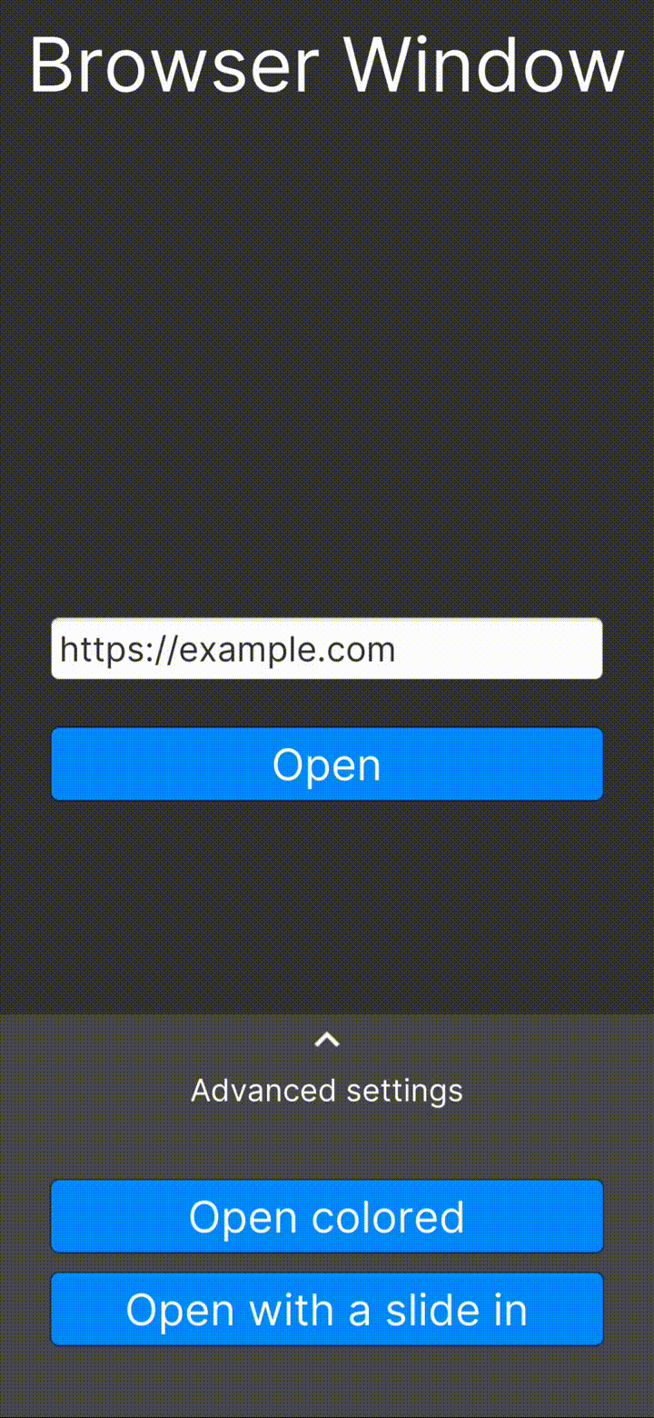 window.CustomOpen("https://example.com");Currently this is only supported on Android. To learn more and see more detailed examples and what settings are supported please read the wiki page on this feature.