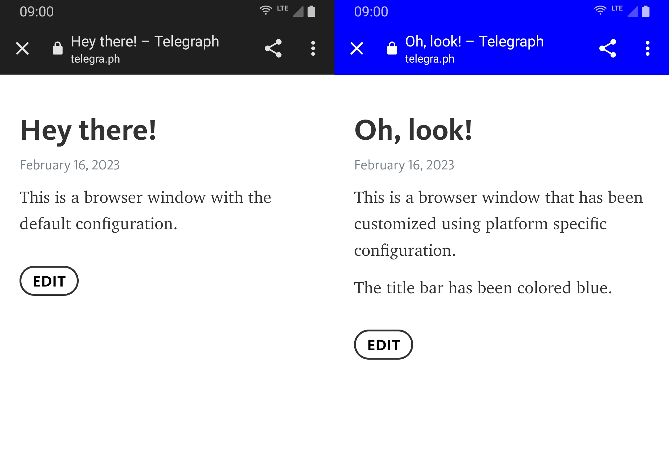 Sometimes, a Browser Window implementation on one platform might support more features than one on another platform. To give developers the ability to control these options, 1.1 introduces platform-specific configuration.