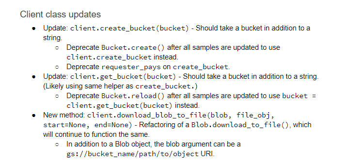 Are there any code samples (here or in https://github.com/GoogleCloudPlatform/python-docs-samples/tree/master/storage) that still use these methods? If so, we should wait to deprecate until those are updated. Also, we should make sure every API request you can make on Bucket can also be done from Client. It'll make for a much clearer developer story when Bucket can be treated as a dumb resource object. |