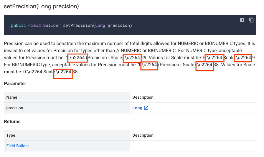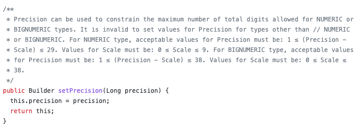at https://cloud.google.com/java/docs/reference/google-cloud-bigquery/latest/com.google.cloud.bigquery.Field.Builder#com_google_cloud_bigquery_Field_Builder_setPrecision_java_lang_Long_