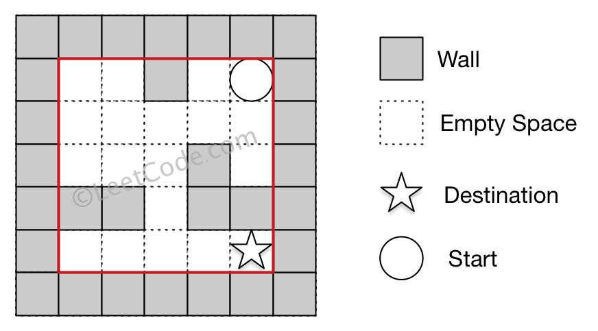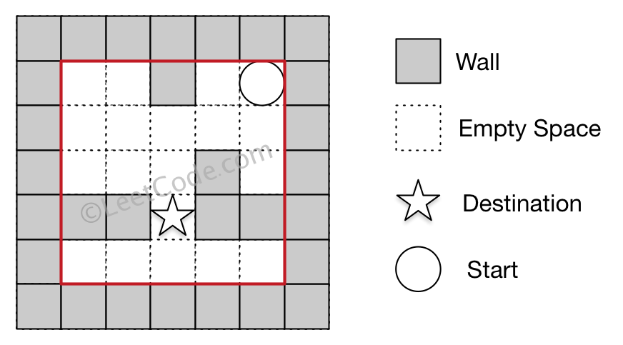 The maze is represented by a binary 2D array. 1 means the wall and 0 means the empty space. You may assume that the borders of the maze are all walls. The start and destination coordinates are represented by row and column indexes.