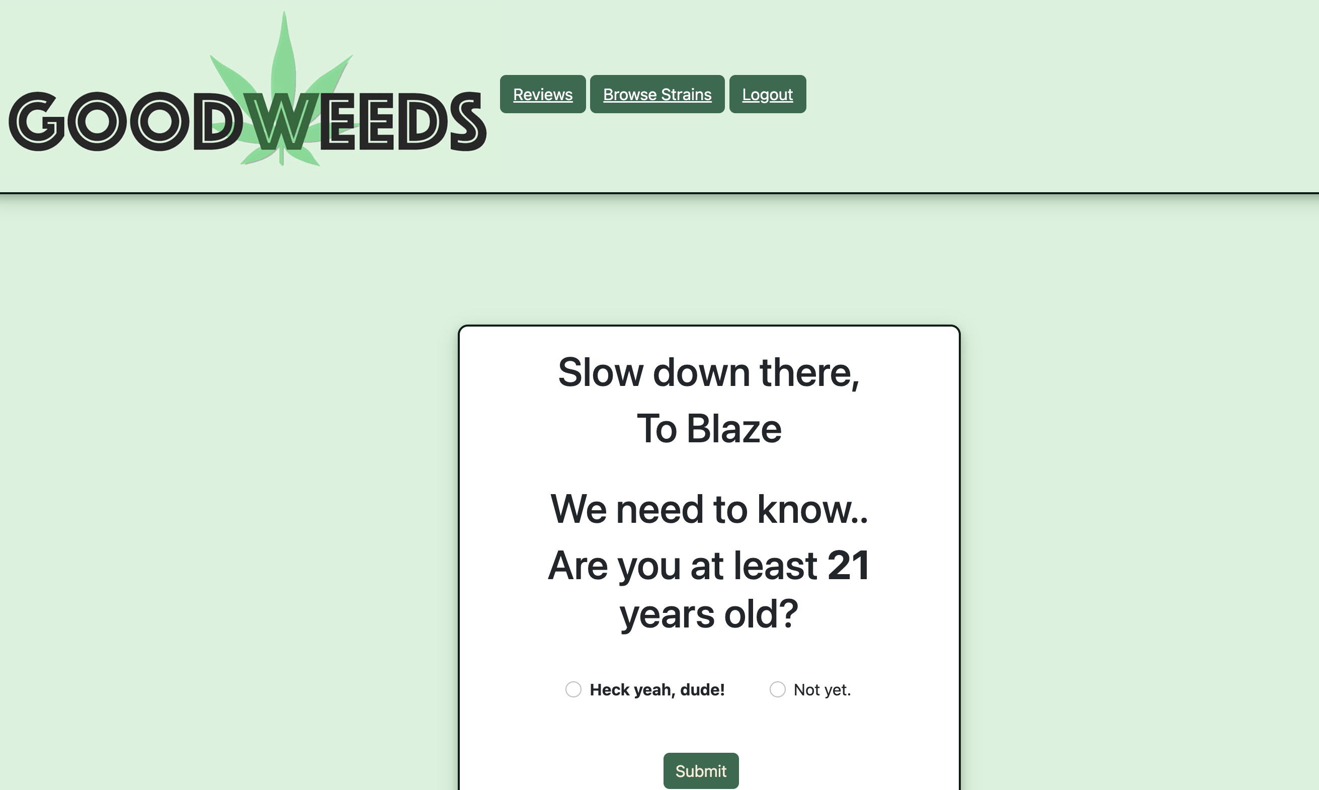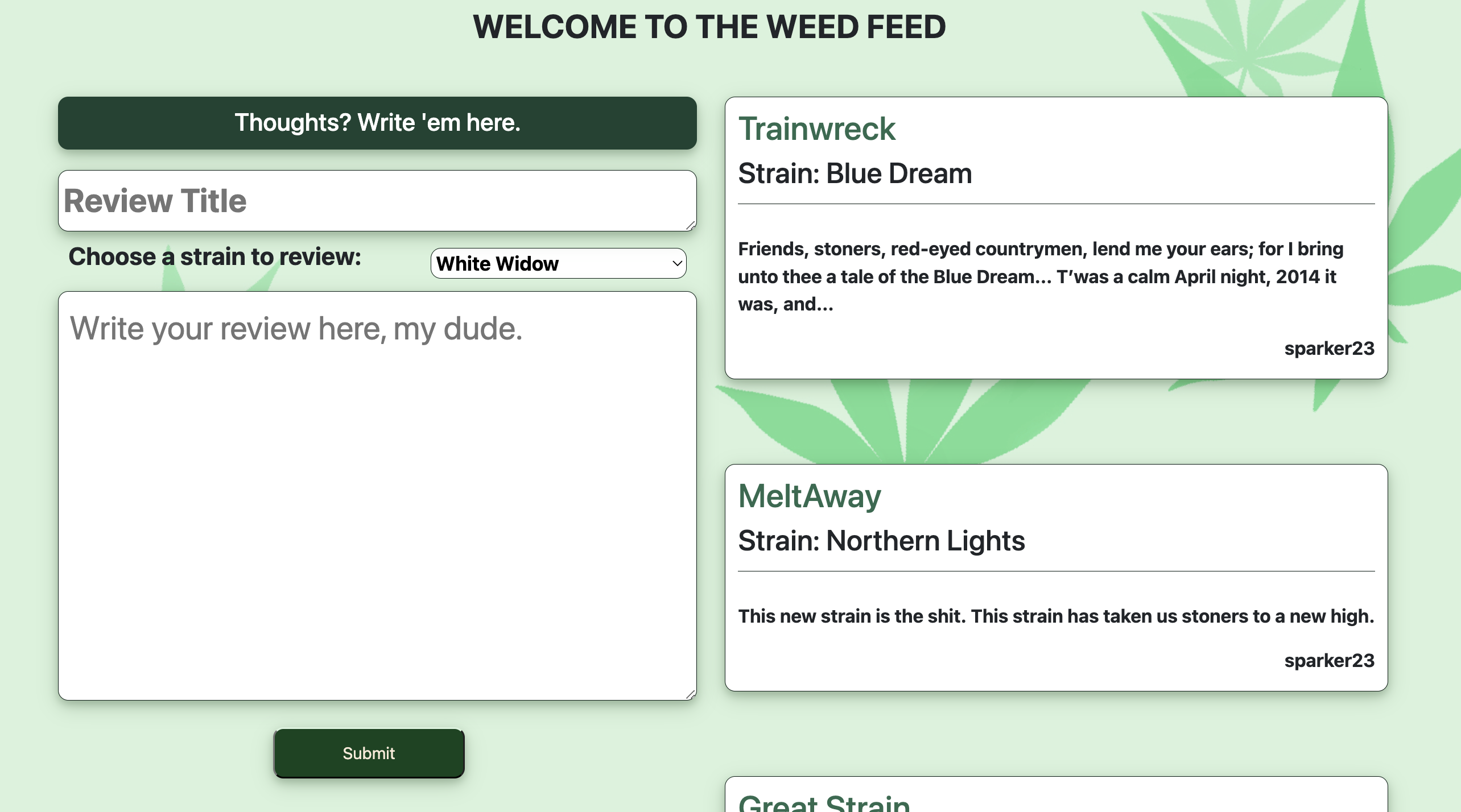 Curate your strain profile and join a community centered around helping people find and share strains they love. A MySQL database and RESTful API allow users to browse popular weed strains, add strains to favorites, and post reviews to the WeedFeed. The live link can be found here and the repository can be found here.