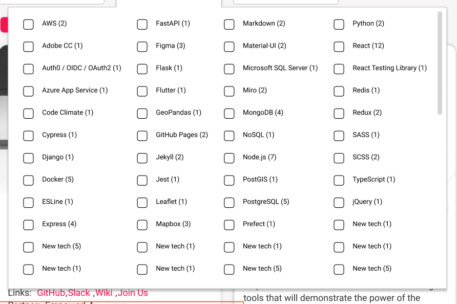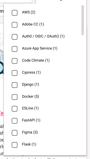 TechnologiesLanguages / Technologiesdropdown to be 768px wide and the checkboxes create the appropriate columns to fit all technologies and languages. Also, include the scrollbar. - Ensure the dropdown matches
