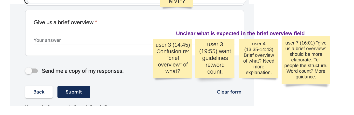Based on the Wins submission research findings, users are confused about what is expected in the "brief overview" question on p.4 of the Win submission form. Users would like word count suggestions, and additional guidelines on what we want them to write.