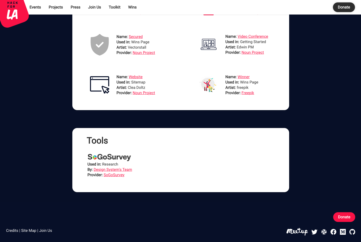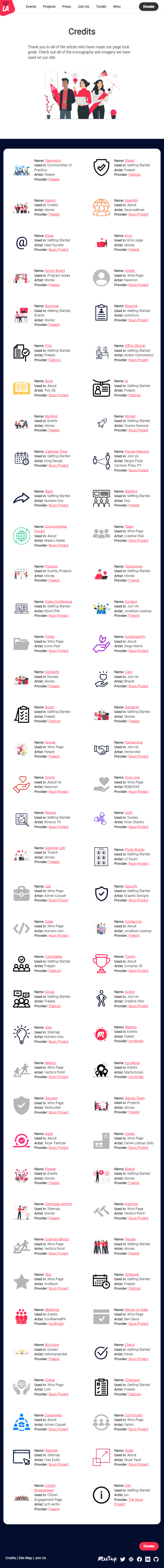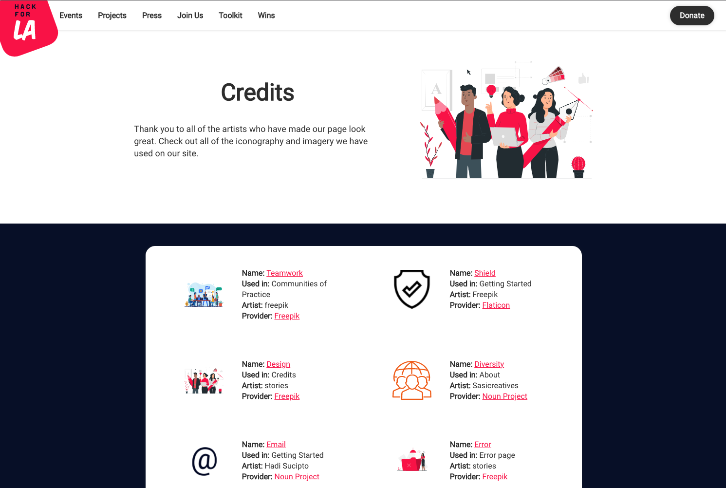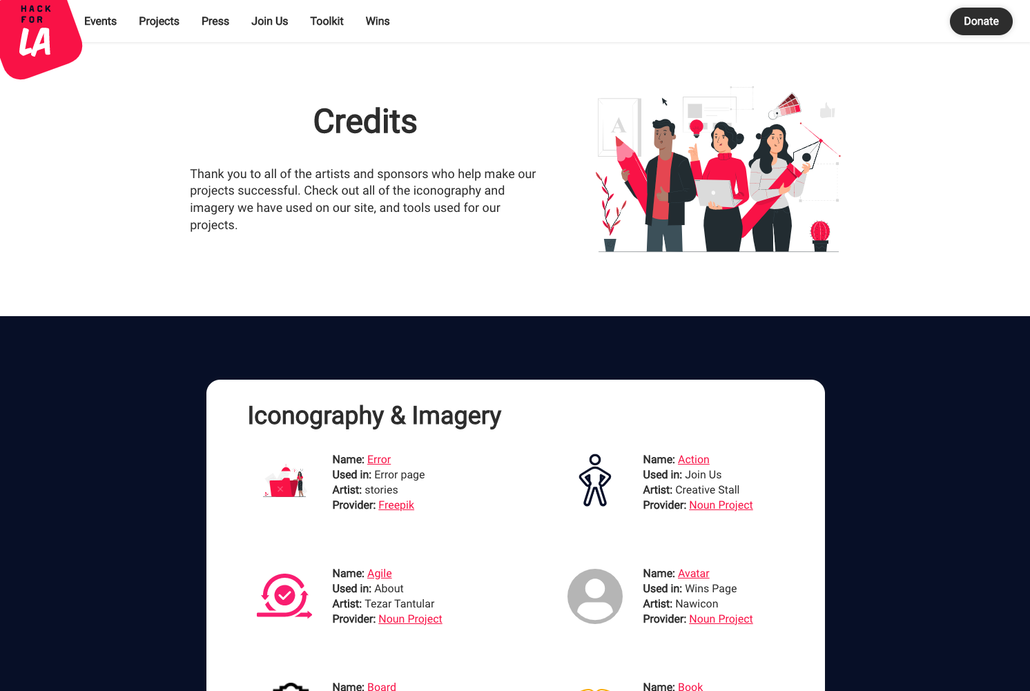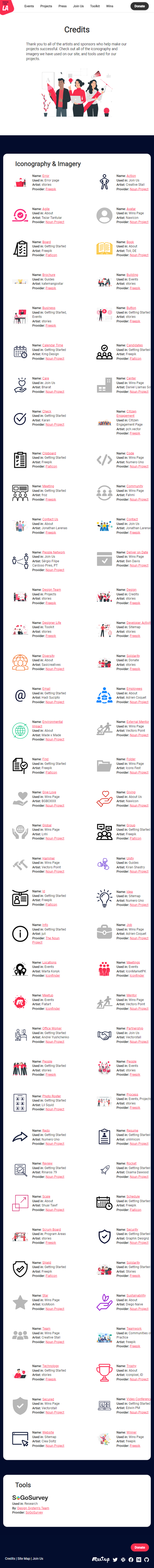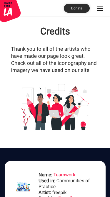 I see the credits for the "Iconography & Imagery" section is cutoff on the right side in tablet view when I view your changes using Docker. How the credits look in the "Iconography & Imagery" section should be the same as on the current website.