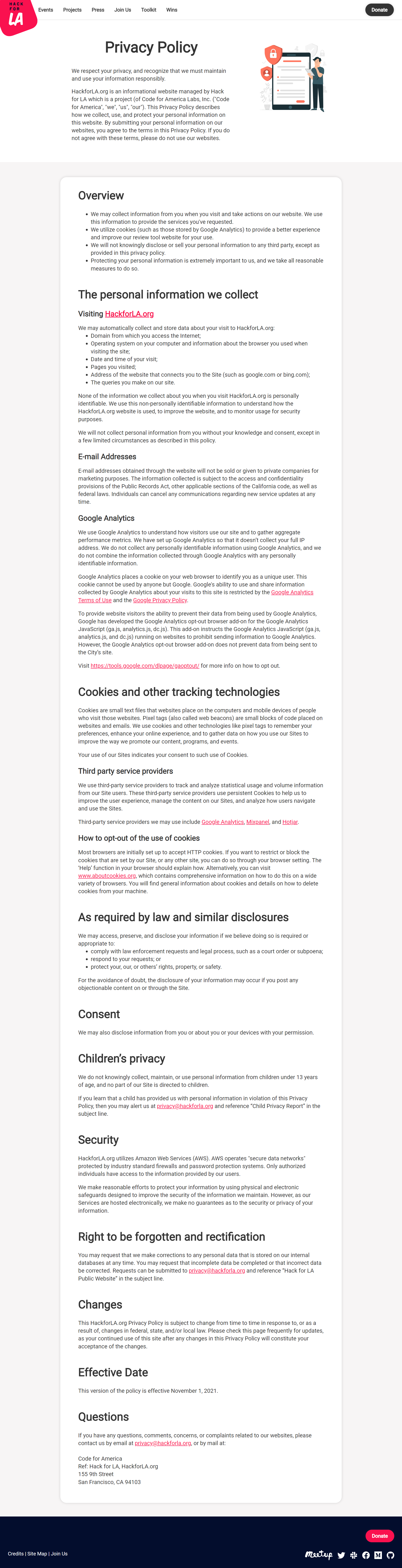 * Homepage redesign (hackforla#2373) * Adds communities of practice icons * Adds COP icons to credits * Links icons to CoP yml * Update nav link * Add communities icons for home page * create new contact use section * create new hero section of home page * create home page communities section * create home page join us section * create mvp for home page program areas * Adds anchor for home page links * adds new home page technology section * create home page wins section with wins card * restyles home age for redesign * Update program areas images * Add border radius to containers * Update padding on embrace section * Hero mobile design * Remove join text on mobile view * Fix join text on tablet-up * Remove contact text on mobiel view * Develop mobile technologies section' * Fix header padding * Update hero CoP icons credits links * Update hero CoP icons credits links * Communities section mobile version * Create small button element * Final communities section gradient fix * Random homepage win logic: * Hide horizontal sidebars to match design * Reposition homepage win overlay * Resolve filename typo * Change dataKey to match JSON variable * Reposition home join us header * Update photo for Civic Tech Infrastructure * Use new _wins-data * Update image link to use absolute_url variable * Add homepage program areas links * Refactor home wins js for _wins-data * Disable link leading to about page * Fix broken link path * Remove about page link from main nav * Move nav button styling to appropriate selector * Sm 1 feature homepage launch (#18) * Update meeting data * Update meeting data * Update contributor and language data * Added few points to issue progression action item Added few points to issue progression action item * Update meeting data * Update contributor and language data * Update meeting data * Update contributor and language data * Update meeting data * Update contributor and language data * Update add labels trigger hackforla#2939 (hackforla#3042) * Update add-labels-template.md * Update add-labels-template.md Rearranged original note * Update open-community-survey.md * Updated pre-work developer template * Changed typo in _projects/home-unite-us.md from 'non-profits' to 'nonprofits'. (hackforla#3062) * Update meeting data * Update contributor and language data * fixed the spelling of sustainability (hackforla#3067) * Update pre-work dev issue template * Update meeting data * Update contributor and language data * Update issue templates Added Wiki: Research Plan Review: [REPLACE WITH NAME OF PAGE] * Updated Project Profile Card review and update issue template * Update issue templates updated designer time * Updated Credits file template: Edit content field and remove type field * Updated Credits file template: Edit content field and remove type field * Update meeting data * Update contributor and language data * Fix misspelling of "community" on line 93 of pages/join-us.html (hackforla#3072) * Update meeting data * Update contributor and language data * Added feature-tech-dropdown branch * Update meeting data * Added feature-tech-dropdown branch * Added feature-tech-dropdown branch * Update contributor and language data * changed the spelling from webapp to web app on line 56 (hackforla#3073) * Update meeting data * Update contributor and language data * Revert " changed the spelling from webapp to web app on line 56 (hackforla#3073)" (hackforla#3078) This reverts commit f6deeff. * Update meeting data * Update contributor and language data * Update meeting data * Update contributor and language data * Edit content field and remove type field from avatar.yml credits file 2793 (hackforla#3079) * Delete unused project-filter.js file (hackforla#3081) * Update meeting data * Update contributor and language data * Update meeting data * Update contributor and language data * fixed spelling of non-profit to nonprofit, line 77, join-us.html (hackforla#3076) * fixed spelling of non-profit to nonprofit, line 77, join-us.html * Update meeting data * Update contributor and language data * Update meeting data * Update contributor and language data * Add so go survey credit page 3022 (hackforla#3043) * add new headers and tools section to credit page * updated to empty alt tags for tools section * fix snytax errors * fix spacing in code and website page * Fix indentation and add functionality for additional teams in "By:" field * Update meeting data * Update contributor and language data * Update meeting data * Update contributor and language data * Update meeting data * Update contributor and language data * Update meeting data * Update contributor and language data * Edited items on how to pick up your first issue. Edited items on how to pick up your first issue. * Create new Privacy Policy page and its credit, and edit label (hackforla#3083) * Added privacy-policy.jpg * Add privacy-policy.yml to credits * Added initial privacy-policy scss and html files * Added header and overview section * Redoing the html page from scratch * Added a line in main.scss to import privacy-policy.scss * Added header section * Added the content for section Visiting HackforLA.org * Added content for section Email Addresses * Added content for Google Analytics section * Added content up through and including Third party service providers section * Finished adding all the content in the HTML file * Moved the import of privacy-policy.scss to the bottom of the components section Reason is it didn't make sense that I just put it in the middle on the components section without any reason. * Added styling for desktop version of page * Added mobile styling and finished desktop styling * Updated privacy-policy.yml credit * Fixed styling * Fixed styling * Added spacing before the address on the bottom of the page * Clarified "Project Profile Card review and update" template * Update meeting data * Update contributor and language data Co-authored-by: GitHub Actions Bot <hackforla-bot@hackforla.org> Co-authored-by: Sau