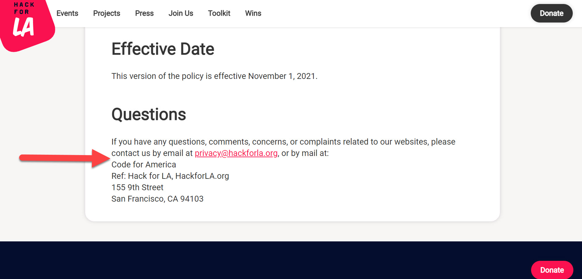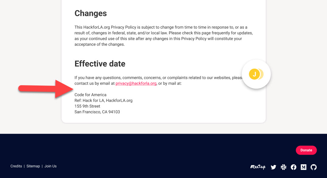 On a minor note, I was a little unsure about the spacing in the "Questions" section at the very bottom of the page, so I wanted to ask about it here, specifically the spacing between the sentence and the Code for America address. In the local browser (as well as in your provided screenshot image), there is no space, as you can see in my first screenshot below. I'm wondering if there should be a space here between the sentence and the Code for America address - where the arrow is pointing in my screenshot.