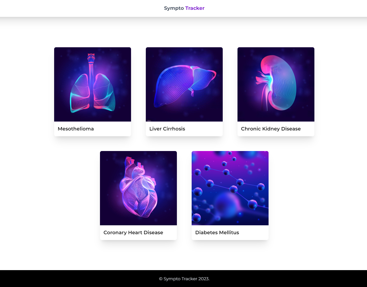 Sympto-Tracker is a web application that allows users to track their symptoms and predict the likelihood of developing certain diseases. The application is built using React, Flask, and RStudio, and currently supports the prediction of the following diseases:
