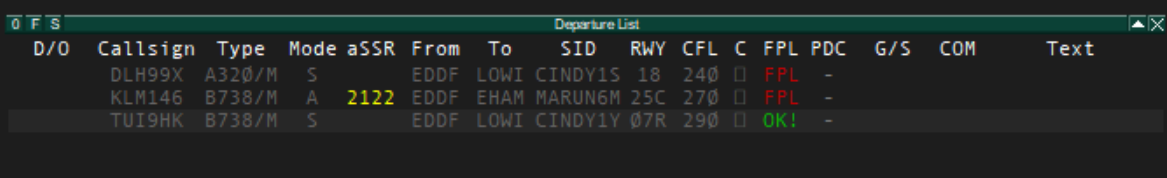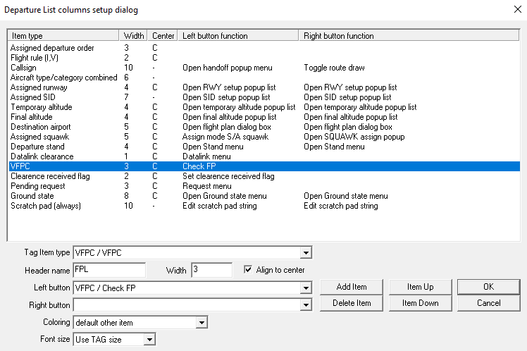 - Tag item VFPC: Shows check-result as green 'OK!' or red 'FPL!' ('SID' = No valid SID found, 'ENG' = Failed Engine type restriction, 'E/O' = Failed even/odd Flightlevel, 'MIN' = Failed minimum Flight Level, 'MAX' = Failed maximum Flightlevel)