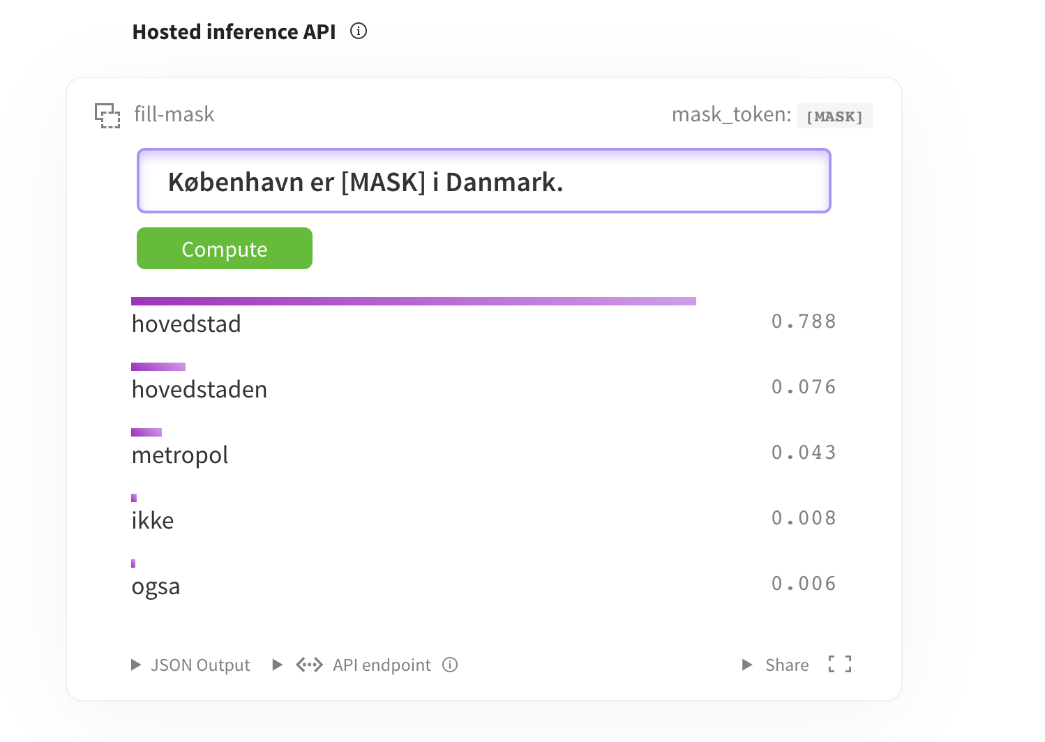 Trying to get Hosted inference API to work. Was following https://gist.github.com/julien-c/857ba86a6c6a895ecd90e7f7cab48046 ... is below the correct YAML syntax? pipeline: - fill-mask widget: - text: "København er <mask> i Danmark."