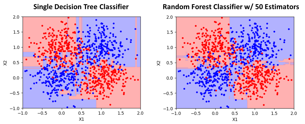 The visualization above demonstrates a random forest model's ability to overcome overfitting and achieve better accuracy on unseen test data. Note how the decision tree learns oddly shaped decision boundaries and is clearly overfitting the training data, while the random forest learns decision boundaries much closer to what one would choose by intuition.