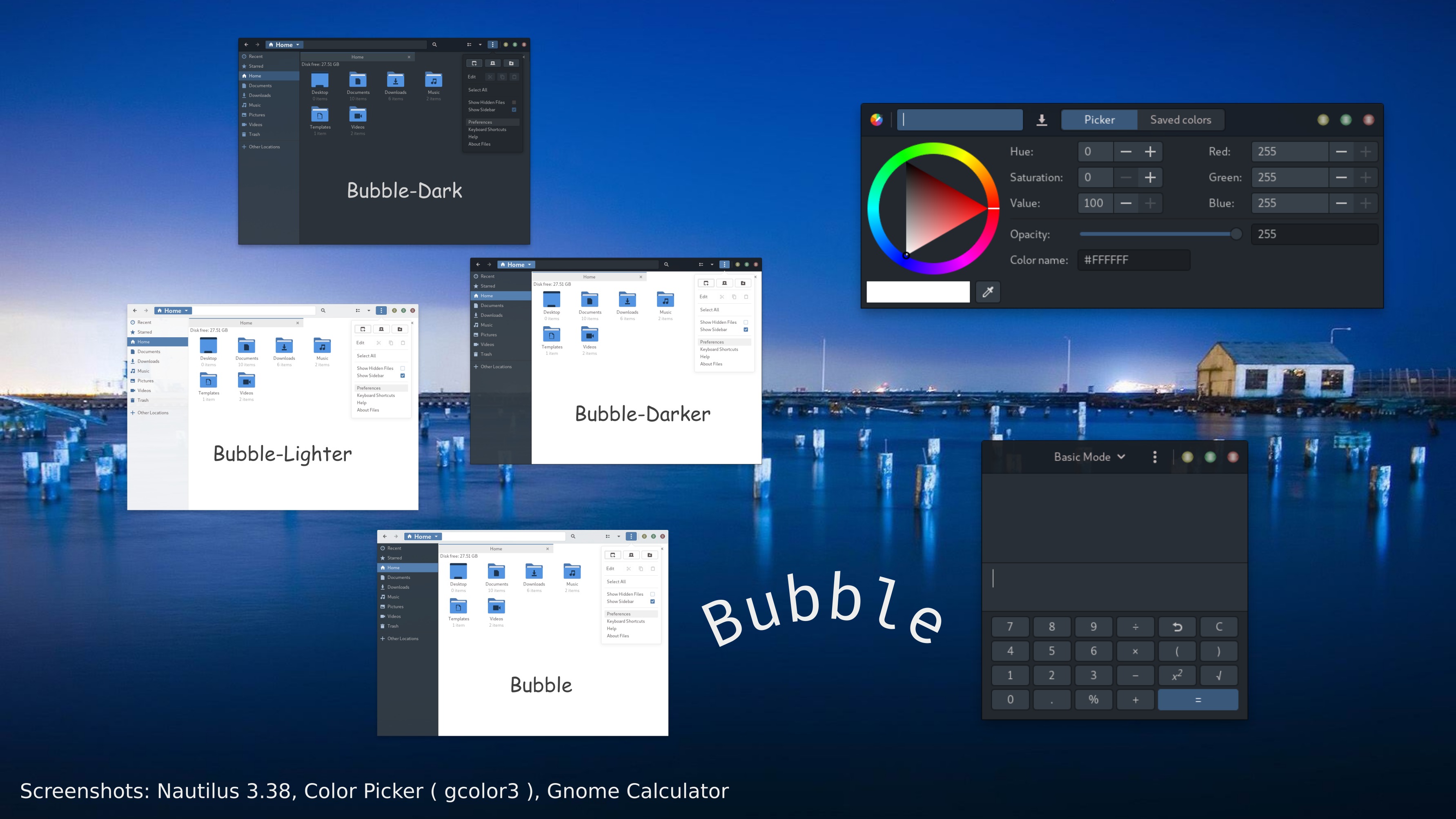 Bubble GTK Themes Gtk2, Gtk3, Gnome shell, Cinnamon, Metacity, Xfwm4 theme base on Arc-Theme Gtk4 theme base on Adwaita License : GPLv3 Theme can be download here Screenshots: