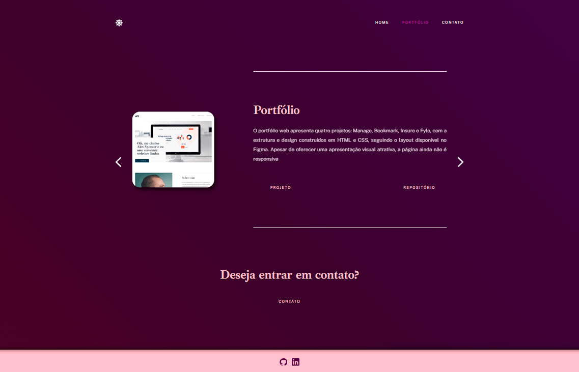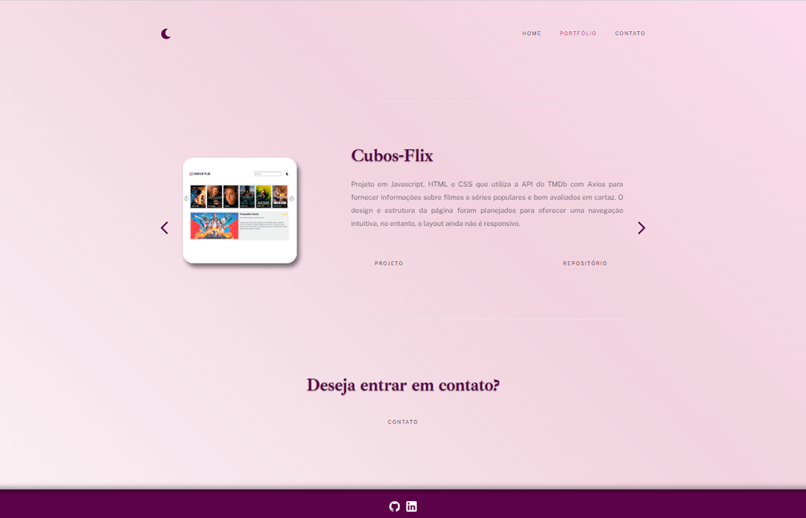 Este projeto é o meu portfólio pessoal, onde compartilho informações sobre mim e os projetos que já desenvolvi. Foi construído utilizando HTML, CSS e Javascript (utilizando a interface de programação DOM), e tem como objetivo expor meus trabalhos, como o CubosFlix, uma página com informações sobre filmes e séries populares e bem avaliados em cartaz. Além disso, apresento uma página fictícia de portfólio que inclui quatro projetos criados para um possível cliente.