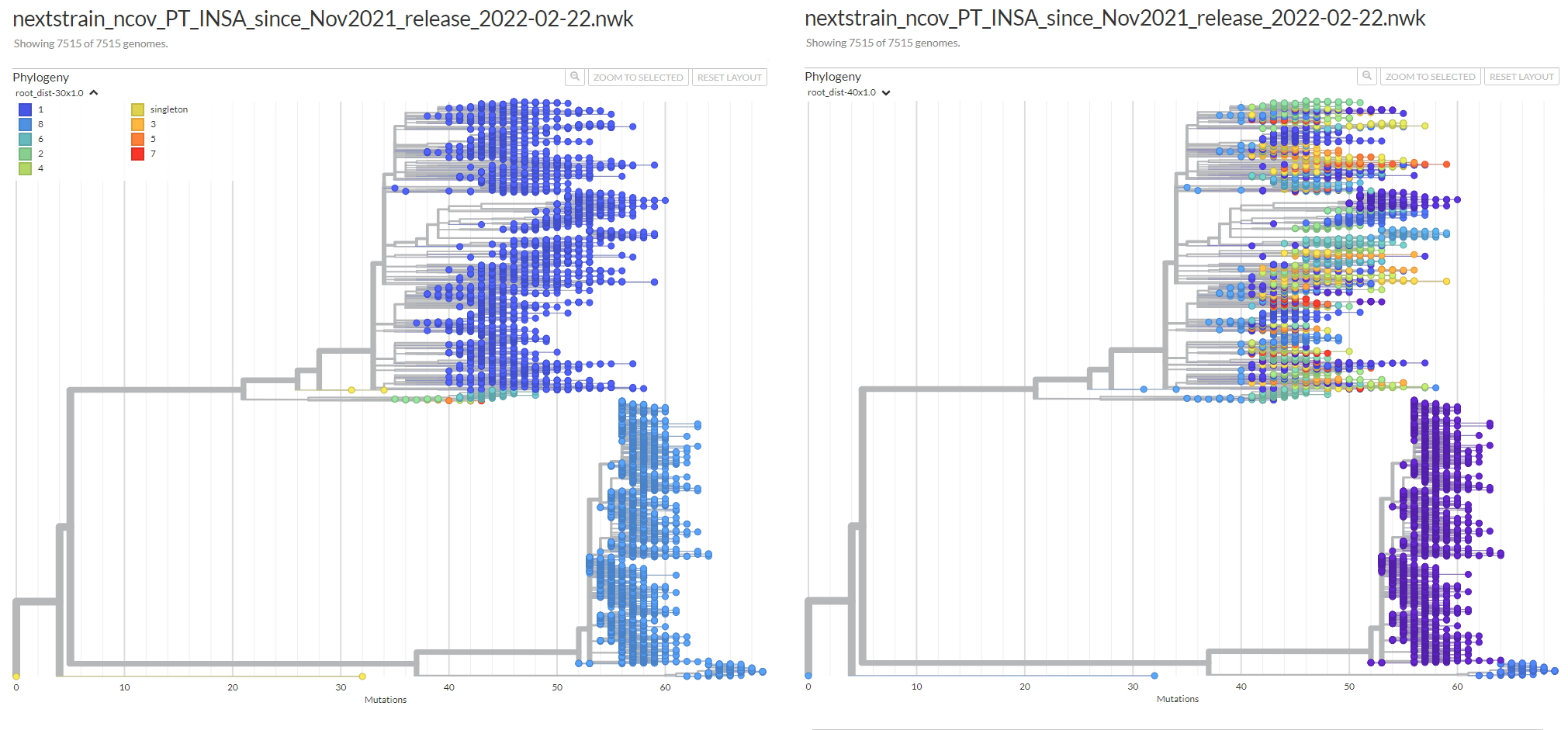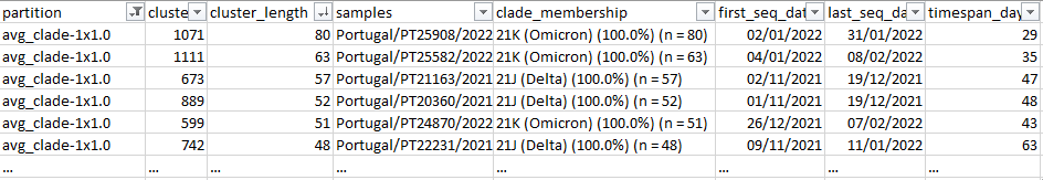 python reportree.py -m nextstrain_ncov_PT_INSA_since_Nov2021_release_2022-02-22.tsv -t nextstrain_ncov_PT_INSA_since_Nov2021_release_2022-02-22.nwk --columns_summary_report n_strain,lineage,clade_membership,first_seq_date,last_seq_date,timespan_days,n_Health_region,Health_region,S1_mutations --metadata2report S1_mutations --method-threshold root_dist-25-69,avg_clade-1,max_clade-2 -out ReporTree_ncov_PT_get_clustersExample of output of the cluster metadata report:
