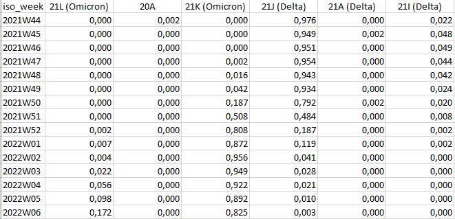 2) Generation of reports on Pango lineage/Nextstrain Clade weekly relative frequencies (and absolute sequence counts) at Regional level (representative sampling) for the last five ISO weeks (2022-W02 to 2022-W06):