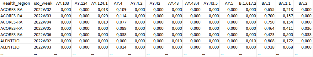 python reportree.py -m nextstrain_ncov_PT_INSA_since_Nov2021_release_2022-02-22.tsv --columns_summary_report n_strain,n_originating_lab --metadata2report Health_region,iso_week -f 'country == Portugal;Representative_sampling == Weekly;iso_week == 2022W02,2022W03,2022W04,2022W05,2022W06' --frequency-matrix 'lineage,Health_region:iso_week;clade_membership,Health_region:iso_week' --count-matrix 'lineage,Health_region:iso_week;clade_membership,Health_region:iso_week;Health_region,iso_week' -out ReporTree_ncov_PT_lineage_clade_reg_freqExample of output of the lineage frequency per iso_week at regional level: