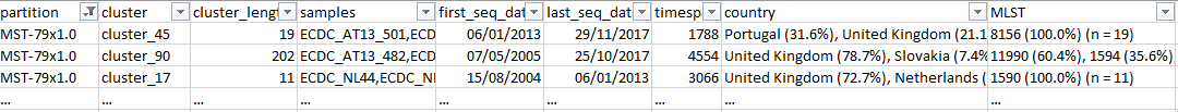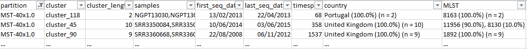 python reportree.py -m input/Listeria_metadata.tsv -a input/Listeria_alleles.tsv --loci-called 0.95 --columns_summary_report country,n_country,source -out output/Lm --analysis grapetree --partitions2report 4,7,15 --nomenclature-code 150,7,4,country --nomenclature-file input/Listeria_nomenclature.tsv --sample_of_interest sample_0269,sample_0675,sample_0010In the partitions_summary.tsv table, ReporTree lists the identified clusters of highly closely related strains (e.g. clusters at <=4 or <=7 allelic differences) that may represent potential outbreaks, and their full characterization according to any user-defined metadata variable (e.g. country distribution, source type, timespan, etc.). Moreover, as a a previous nomenclature was provided for the clusters obtained at 4 and 7 allele distances, this table also comprises information about the nomenclature change.