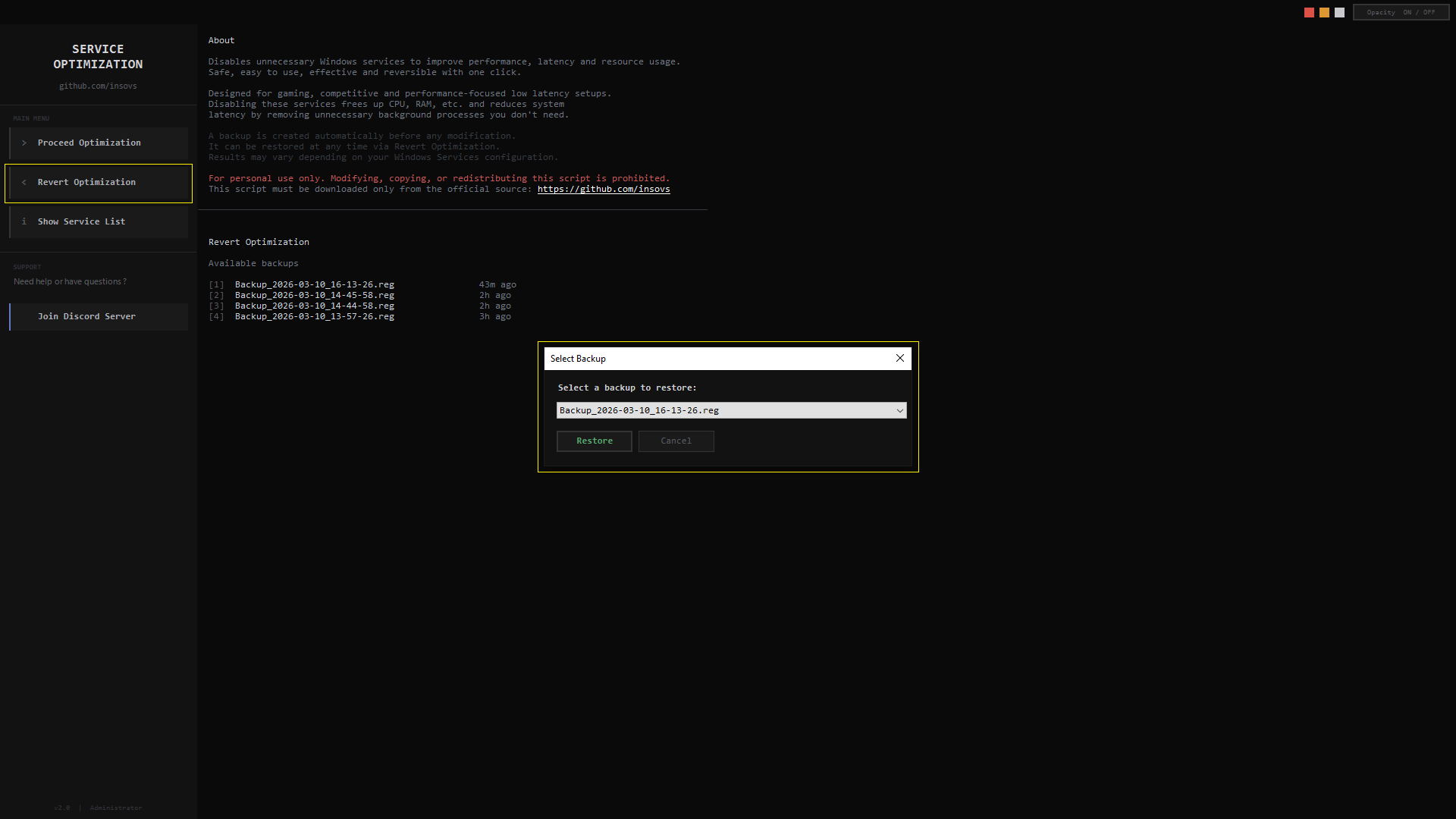 ServiceOptimization.ps1and click Revert Optimization. - Select the backup you want to restore from the list.