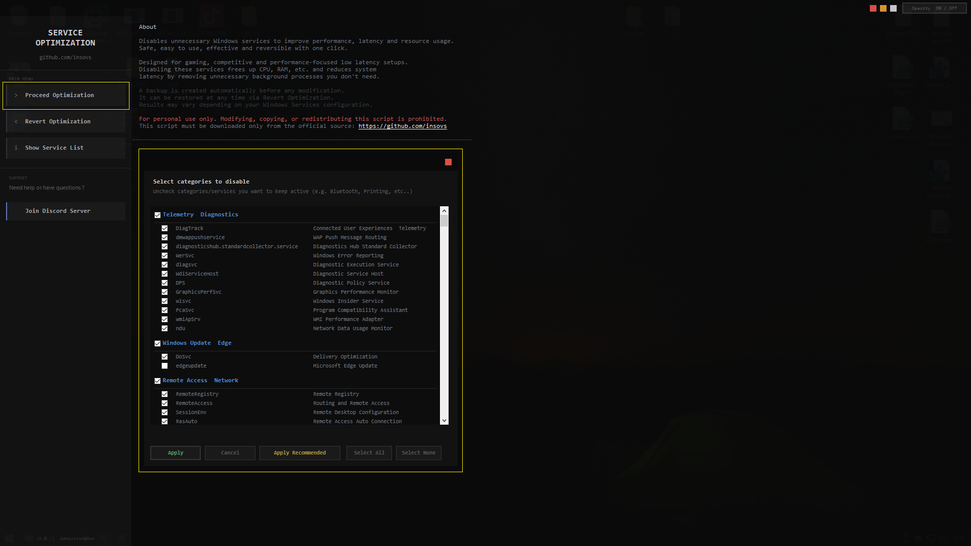 | Proceed Optimization | Opens the category selector — choose which services to disable, then click Apply |
