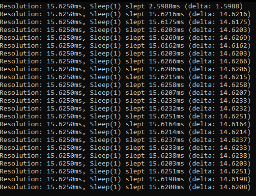 Launches automatically after applying a resolution. It measures how long Windows actually sleeps when asked to sleep 1ms — use it to confirm your resolution is active and stable.