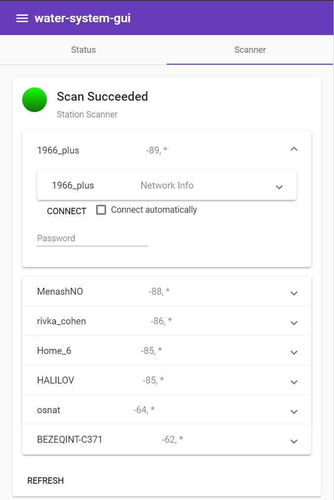 - Now the GUI controlling the ESP (your PC and the ESP are on the same network (The ESP network)). In the GUI go to the 'Station View -> Scanner View' and choose your home network and connect to it (make sure you check the 'auto connect' box to avoid repeating these steps again)