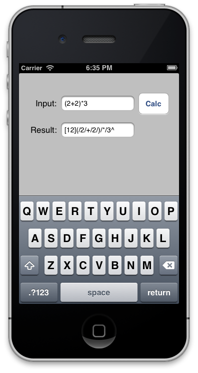 Run the app (make sure you've selected the iPhone Simulator as your run destination), and you'll see the input field is pre-populated with an example expression. Click the Calc button to compute and display the result: