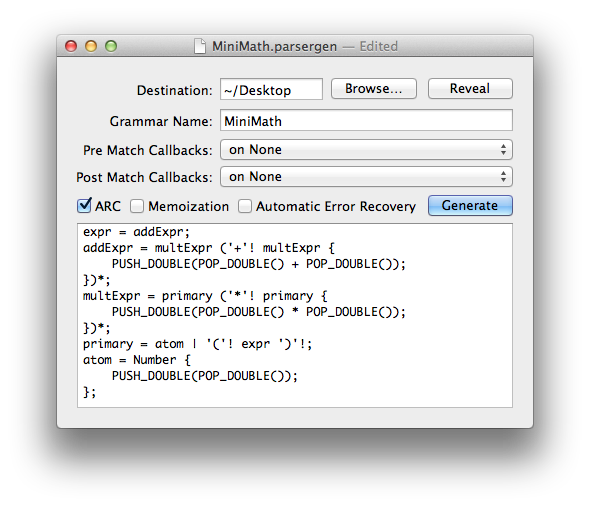 Click the Generate button and notice that MiniMathParser.h and MiniMathParser.m files have been created, and appear on your Desktop. Normally, you'd need to drag these source code files into your app's Xcode project, but in the case of MiniMath, I've included the files already (cooking show style!).