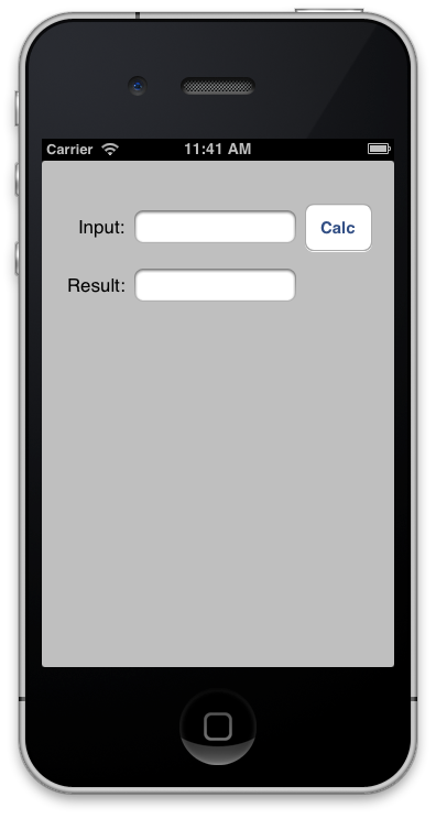 Back in Xcode, switch to the MiniMath target. This target is an example iOS app with an Input textfield, Calc button, and a Result textfield: