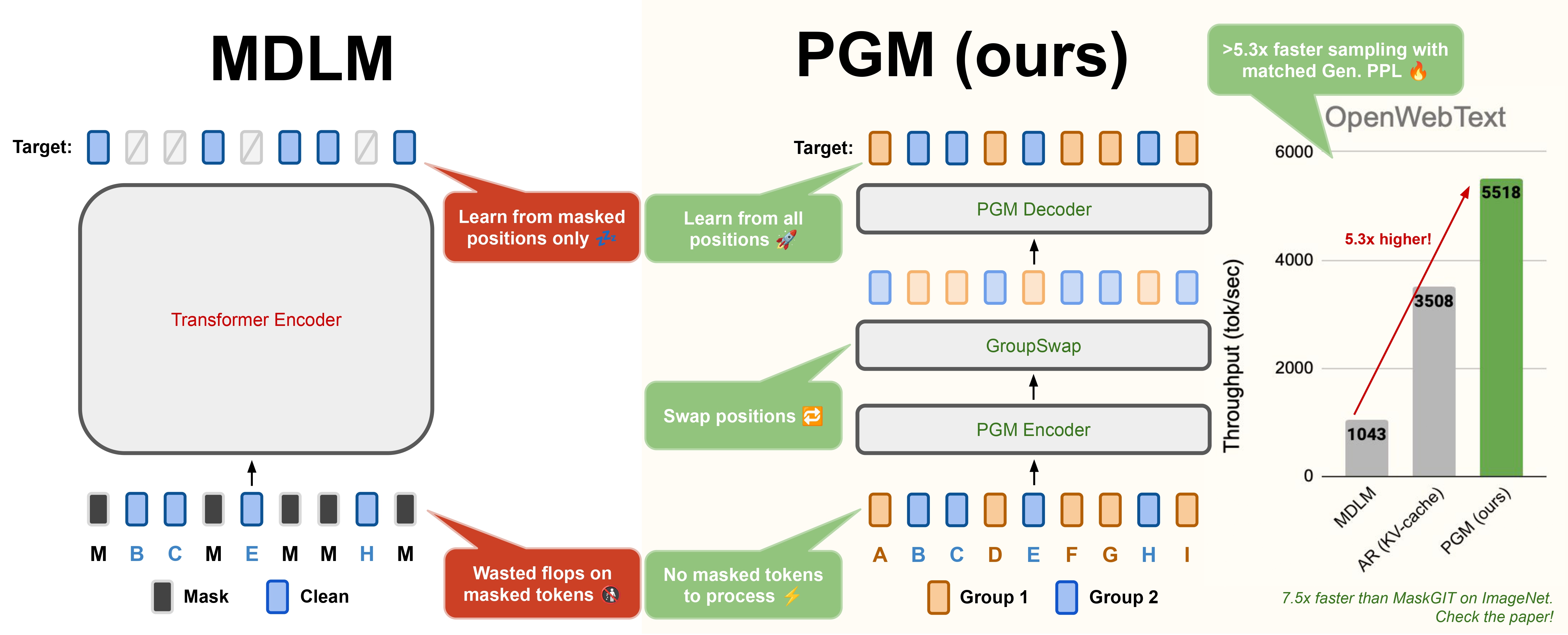 TL;DR: Partition Generative Models (PGMs) speed up parallel generation by partitioning tokens and using sparse attention instead of masking.