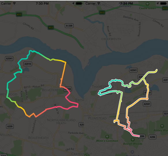 Renders MKPolyline with a fancy multicoloured gradient fill similar to the Nike + Running App. A drop in replacement for MKPolylineRenderer, supports multiple colour stops and an optional border.