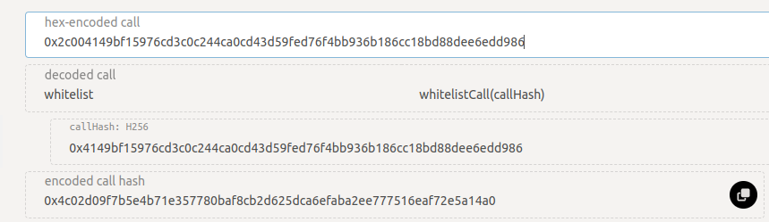 This whitelists a call with the hash of our proposal, 0x4149bf15976cd3c0c244ca0cd43d59fed76f4bb936b186cc18bd88dee6edd986, good.
