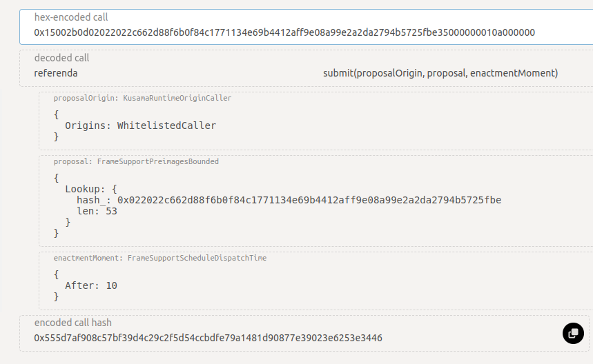 We will use the Kusama referendum example to check the output. Let's check each of these calls and ensure they match our expectations.