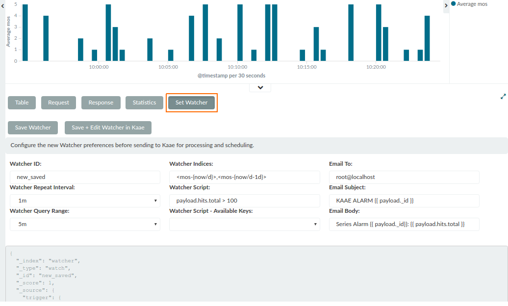 The Kaae integrated Kibana plug-in extends the default Spy functionality to shape new prototype Watchers based on Visualize queries, and providing them to Kaae for fine editing and deployment.