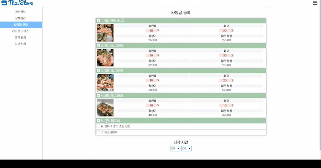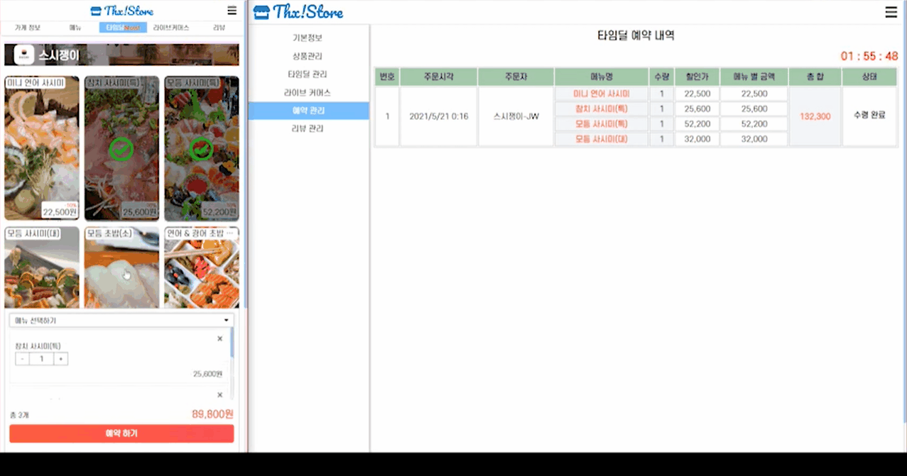 - 박대현 - 가게 매니저용 가게 정보 조회 및 수정 기능 개발 - 휴무일, 운영시간, 카테고리, 가게 소개 수정 기능 구현 - 가게 매니저용 메뉴 관리 페이지 개발 - 메뉴 그룹 조회, 등록, 수정, 삭제 구현 - 그룹 별 메뉴 조회, 등록, 수정, 삭제 구현 - 가게 매니저용 타임딜 등록 페이지 개발 - 메뉴 관리 페이지에 등록한 메뉴들을 타임딜 등록할 수 있도록 연동 - 등록할 메뉴 그룹들을 편리하게 관리하기 위해 아코디언 디자인 구현 - 타임딜 예약 후 시작 전까지 타이머 구현 - 가게 매니저용 예약 관리 페이지 개발 - 예약 조회 및 예약 상태 변경 기능 구현 - pusher 등록을 통해 실시간 예약 주문 확인 가능하도록 구현 - 실시간 예약 주문이 올 경우 알림음이 들리도록 구현 - 타임딜 종료 시간까지 타이머 구현 - 성정욱 - 스토어 수정 페이지 생성과 관리자 승인, 반려 모달 추가 - 사용자용 스토어 페이지 개발 (스토어 소개 컴포넌트, 메뉴 컴포넌트, 타임딜 컴포넌트) - 스토어등록 시 위도, 경도 좌표 값 계산 (카카오맵 API ) - 스토어 소개페이지에 사용자 위치와 스토어 위치 값 마커로 표시 (카카오맵 API) |