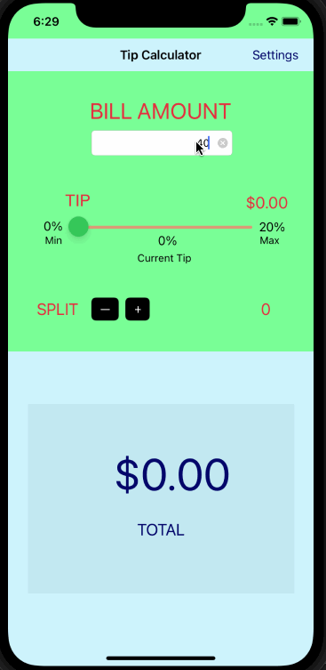 - Making sure the keyboard is always visible and the bill amount is always the first responder. This way the user doesn't have to tap anywhere to use this app. Just launch the app and start typing.