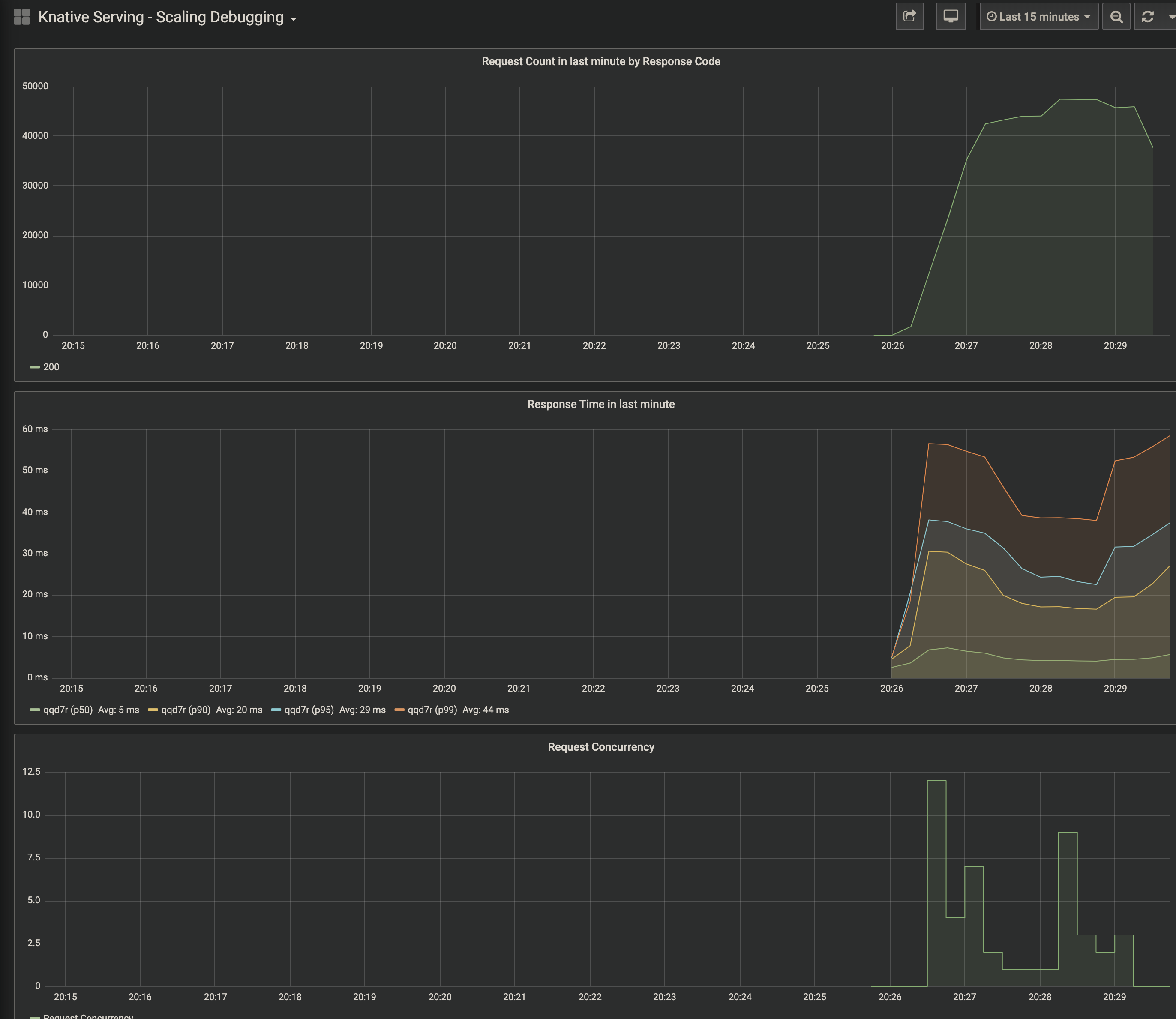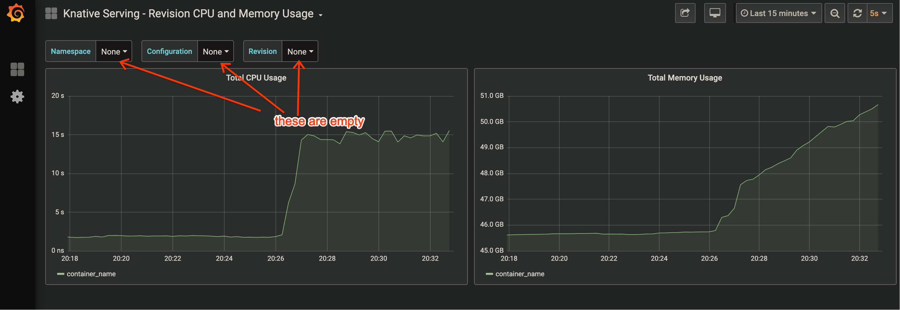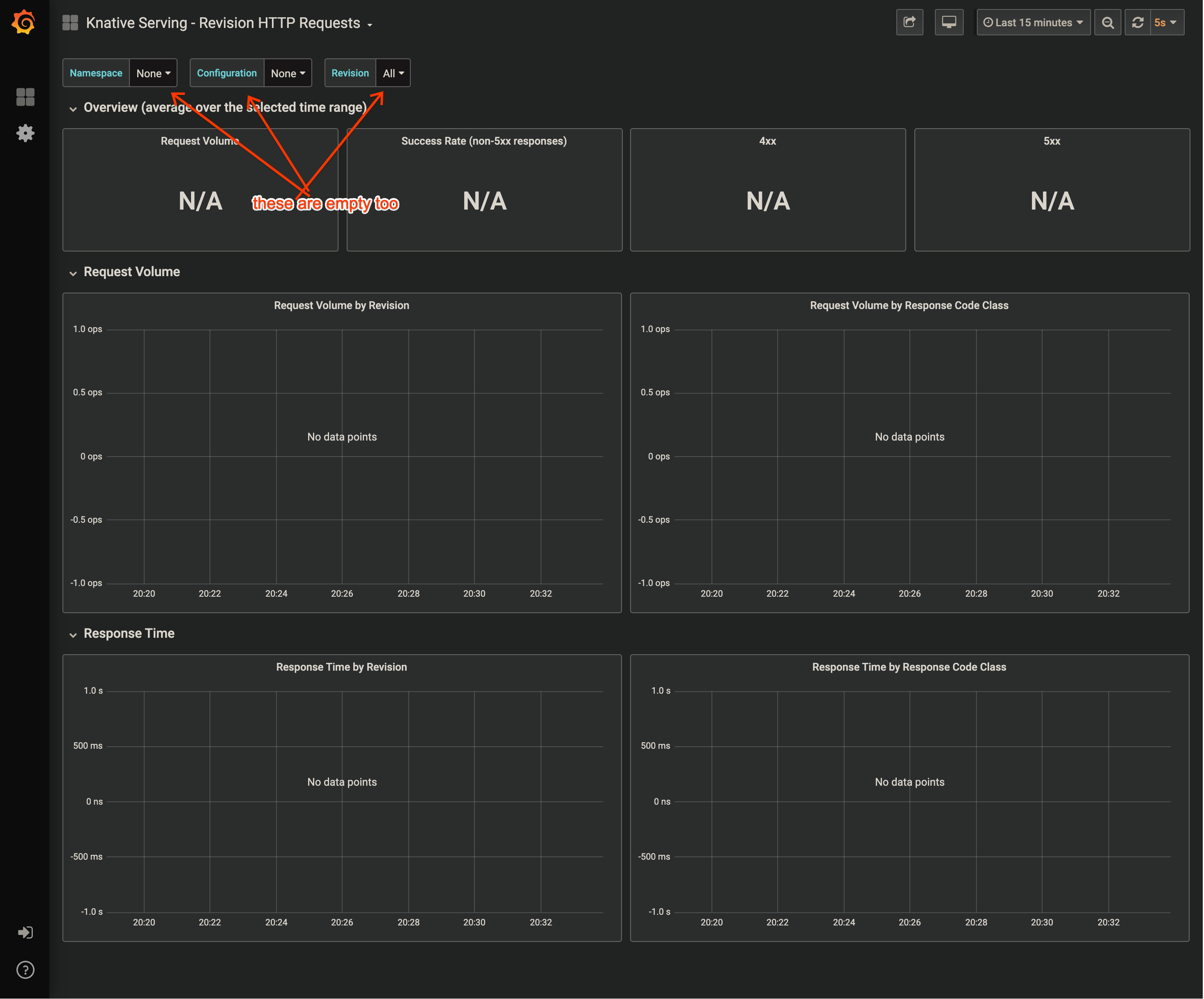 When I look at Grafana dashboards, I see some telemetry about autoscaling metrics but the Revision Request Count metrics are empty. It doesn't even show any namespaces, configurations or revisions to choose from in the dropdowns.