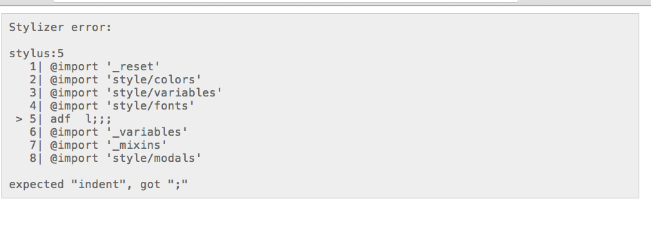 - Create a css file which, on a stylus build failure, hides your app body and replaces it with something like this to help you spot stylus errors easily: