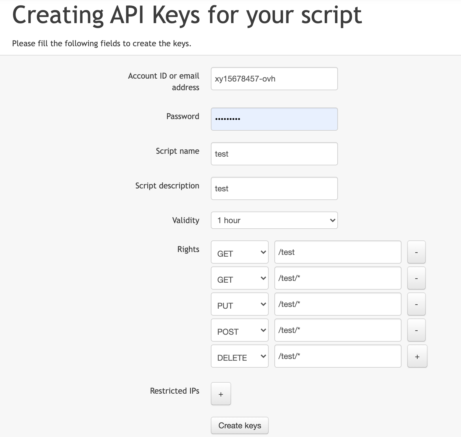 enter your OVHCloud ID (warning the ID is not the email address but your ID ending with -ovh) - Once your identifiers are filled in, you just have to give a name and a description to your script and then assign the rights and the duration of validity of this token.