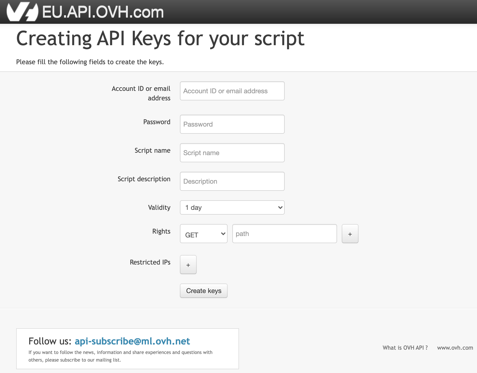 - Then go to the website : https://eu.api.ovh.com/createToken/