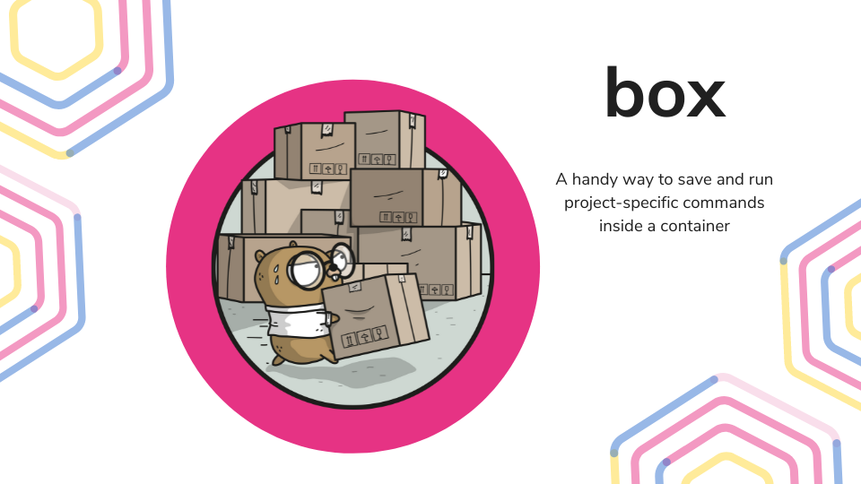 box is a command runner that uses a container-first approach to execute commands. It runs on host system as well as inside docker equally well. It is a simple, yet powerful tool that can be used to avoid the hassle of installing heavy or one-off packages and remembering the docker syntax.