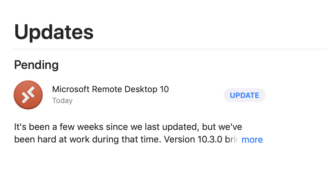 409203825 Numbers (6.1)App Store lists Microsoft Remote Desktop version as (10.3), and is prompting to upgrade.